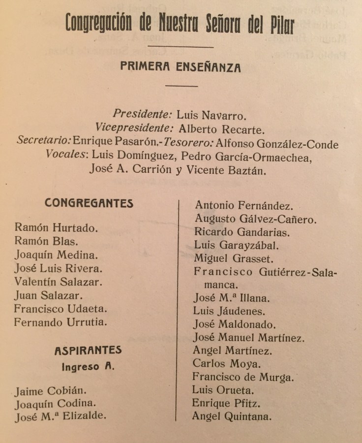 Hoy os traemos la lista completa de los congregantes y aspirantes de la Congregación de Nuestra Señora del Pilar en 1918: