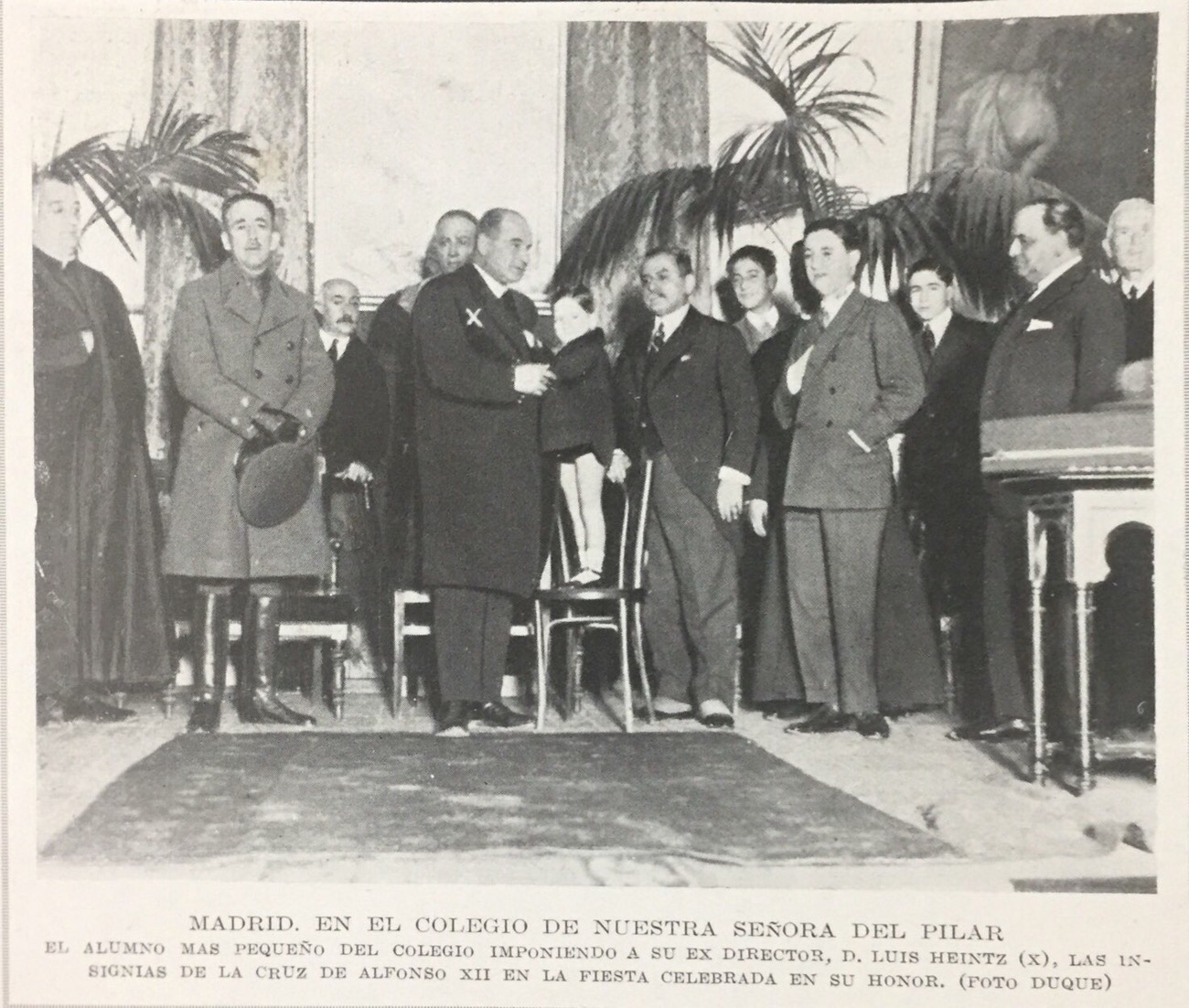 El documento que se presenta a continuación muestra el momento en el que se imponía la distinción a D. Luis Heintz. Como se ve en la imagen, fue el más pequeño de los alumnos, Fausto Rodríguez de Viguri [3], quien se encargó, subido a una silla, de imponerle la insignia.