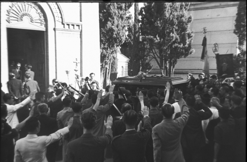 Sobre el féretro de Javier que, como el otro, va cubierto por unas banderas humildes, luce el trozo de raso amarillo del guion de la Primera Línea de Madrid.