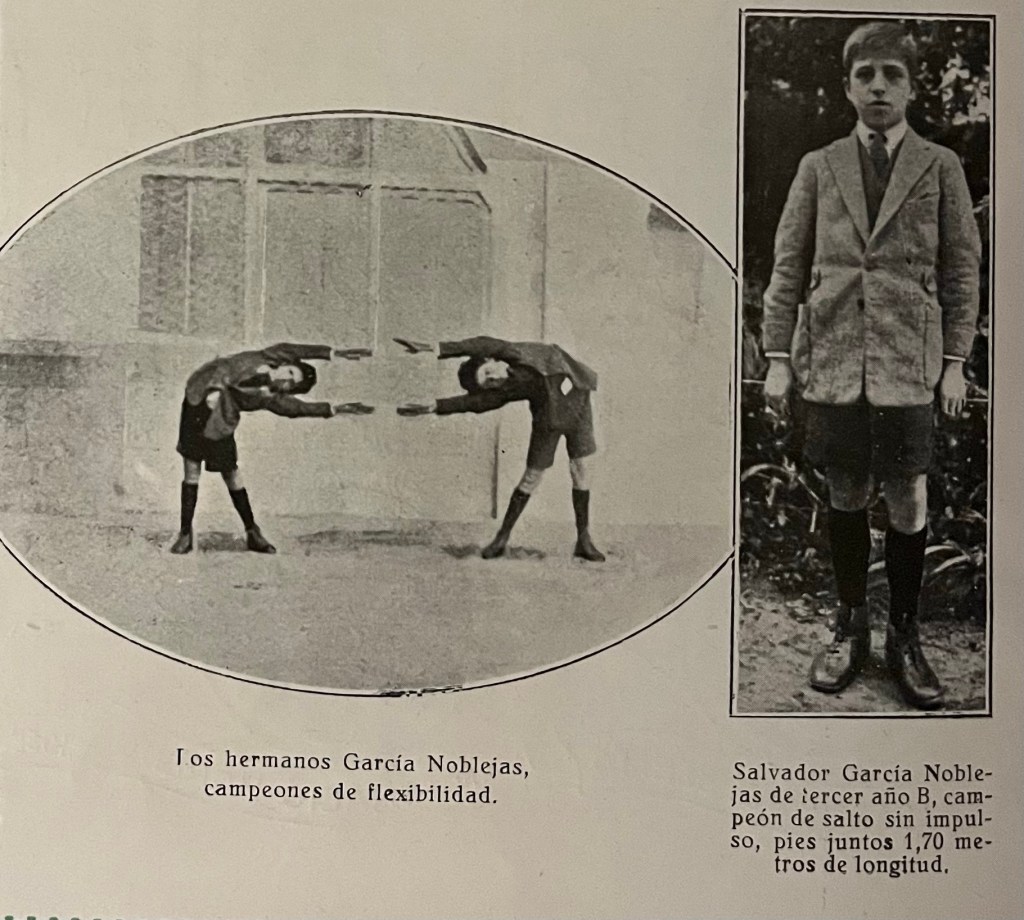 La pareja Salvador García-Noblejas y Quesada (1873-1936) – Laura Enedina Brunet Goitia (1877-1961) debió contraer matrimonio en 1902 ya que la petición de mano se publicó en Febrero de ese año [2]. Fruto de este matrimonio nacieron siete hijos: Jesús (1906-1937), Ramón (1906-1942), José (1908-1936), Javier (1911-1941), Salvador (1913-1936), Laura (1919-2013) y María Josefa. Todos los varones estudiaron en el Pilar perteneciendo respectivamente a las promociones de 1920, 1921, 1922, 1925 y 1928. De las revistas escolares de esa época podemos extraer alguna información. Por ejemplo, que Jesús, Ramón y José hicieron la primera comunión juntos en la Iglesia de la Concepción (ver Alumnos comulgantes en el curso 1913-1914.); o que eran bastante buenos estudiantes como se desprende de las apariciones de José en el Orden del Día y de Javier en el Libro de Oro del colegio. Sabemos igualmente que la familia fijó su residencia en la calle Recoletos nº 12, 2º de Madrid muy cerca de donde estaba ubicado el colegio en esos años.