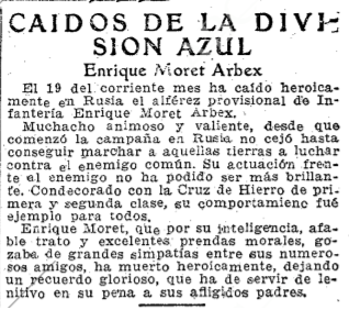 - «Homenaje al alférez provisional Don Enrique Moret Arbex», ABC del 3-VII-1959. Fuente: Hemeroteca ABC.