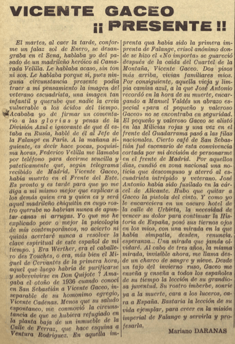 Autorizadamente se me informa que su hijo, nuestro magnífico camarada Vicente, ha caído en las heroicas filas de la División Azul. No es posible medir ni la magnitud del sacrificio que usted ofrece ni la alteza de la hazaña con que su glorioso caído acaba de rubricar su brillante historial falangista, coronando las sublimes generosidades aportadas por la familia Gaceo en servicio de nuestra España inmortal. Dios Nuestro Señor ponga en su corazón de madre fortaleza cristiana, española y falangista para mantenerse firme en esta nueva y terrible prueba. En ella le acompaño con mi más viva emoción y afecto.