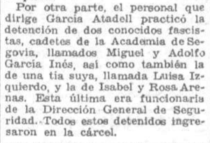 Adolfo, de 25 años, estaba destinado en el Regimiento de Artillería Ligera número 13 con base en Segovia. Sin embargo, supongo que debido a las vacaciones de verano, se encontraba en Madrid, en casa de su madre en Goya 45. El 1 de septiembre de 1936 un grupo de milicianos de la Brigada de García Atadell se dirigen la casa de la familia García-Inés en Goya. Allí es detenido a las cinco de la tarde el joven Miguel de 22 años, y un par de horas después es detenido Adolfo en el ático de la calle Alcalá 163 donde vivían sus tías Dolores y Luisa Izquierdo.
