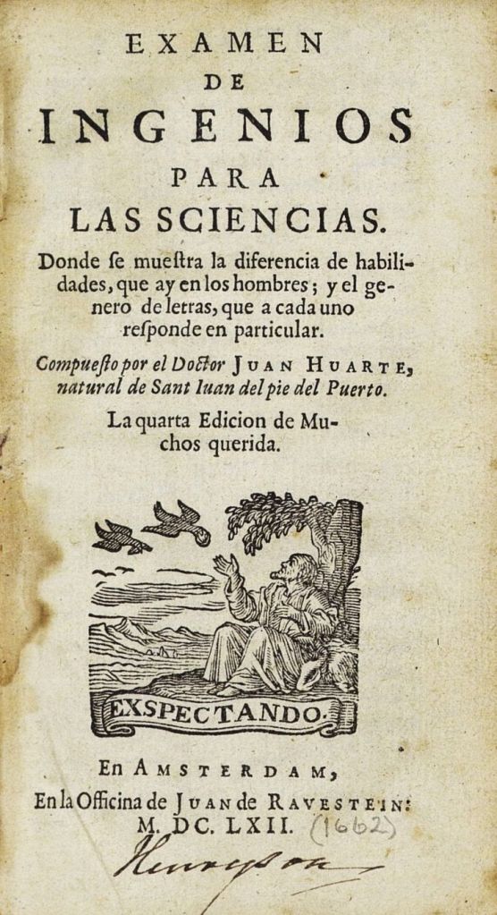 Posteriormente, otros filósofos aludieron, siquiera indirectamente, a estos asuntos, pero hay que llegar al siglo XVI para que el problema de la orientación profesional se plantee de modo claro y concreto. Cupo la gloria a un médico español, Juan de Huarte [3], quien, en su libro Examen de ingenios para las ciencias, se hace esta pregunta: